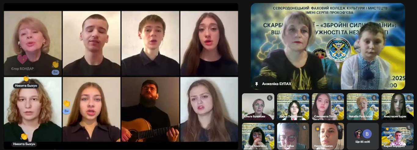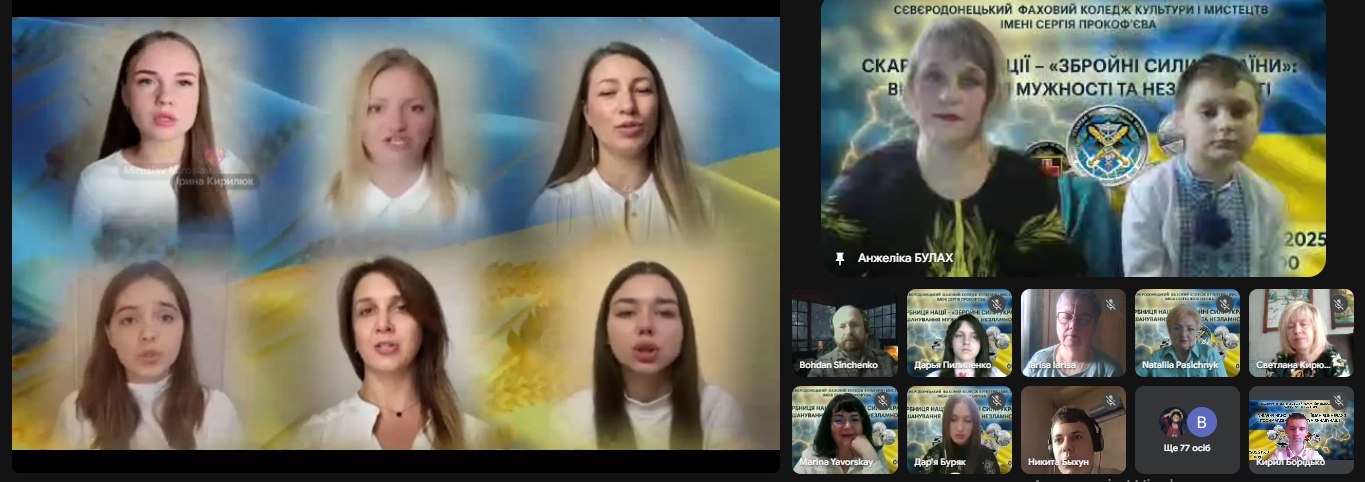 Переглянули патріотичні відеокліпи «Ой, у лузі червона калина», «Вставай, Україно!», «Маємо жити!» естрадного хору “Glorious”, під керівництвом Юлії Бражнікової; «Мить» хорового ансамблю "Mixed voices" під головуванням Ольги Міхалєвої та авторську роботу Віталія Каби «Ми, як соколи вміємо літати»; «Музичне мереживо» композитора Наталії Пасічник. У виконанні студентів прослухали «Молитву захисників України» та слова подяки нашим захисникам.