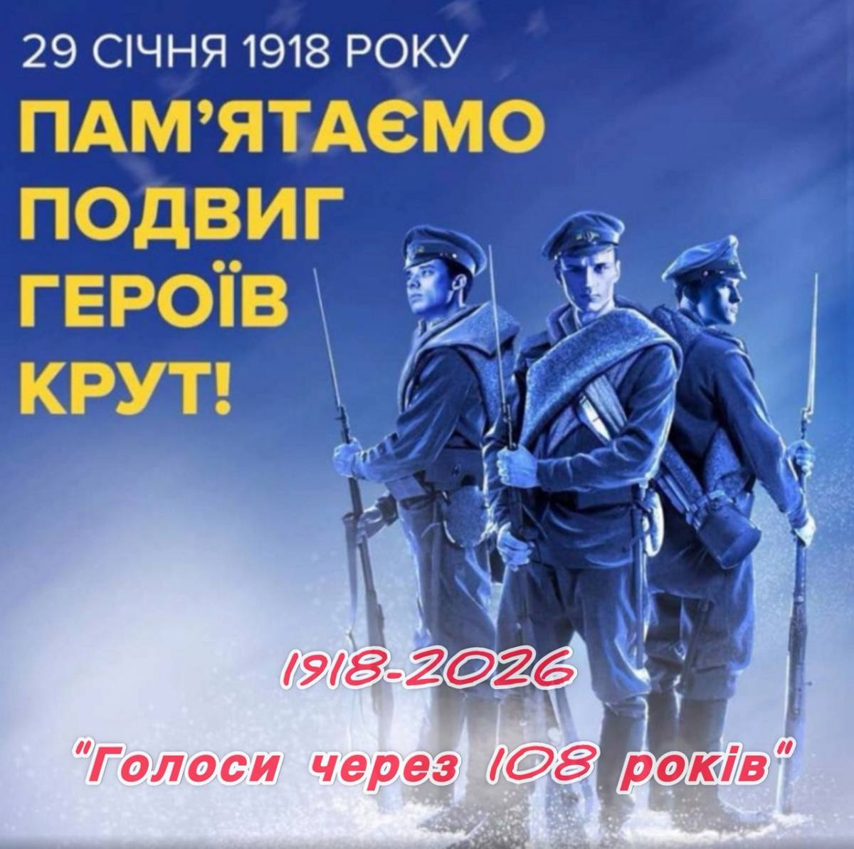 Герої Крут — молоді, сміливі, свідомі — кликали на подвиг заради майбутнього Української держави. Їхні голоси не стихли з плином часу: навіть через 108 років вони звучать сьогодні, нагадуючи про ціну свободи й закликаючи до боротьби з російськими агресорами.